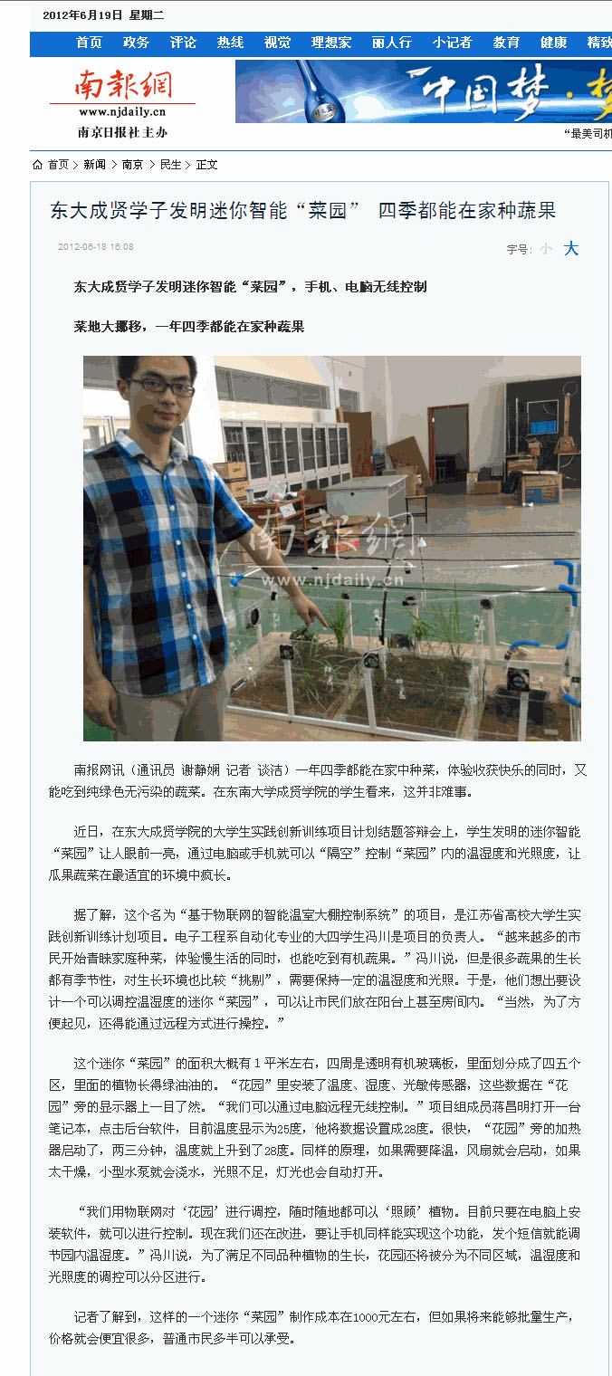 【南报网】东大成贤学子发明迷你智能“菜园”,手机、电脑无线控制