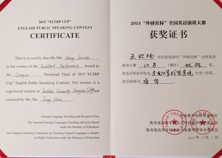 在英语演讲大赛江苏赛区决赛中,来自全省70所本科院校的151位学生参加了比赛,开云2014级药事管理2班的吴家陆同学(指导教师:李倩)和2015级财务管理2班的王钦楠同学(指导教师:蒋华)均获得了江苏赛区优胜奖。