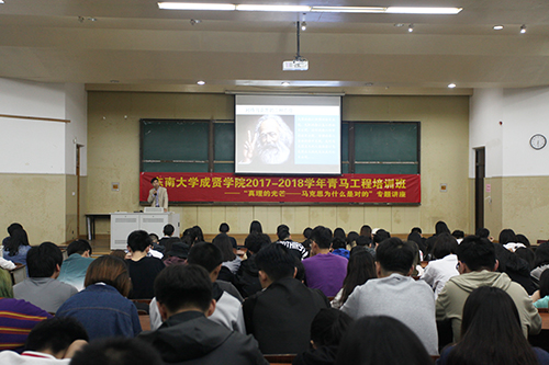 为纪念马克思诞辰200周年,学习习近平总书记在纪念马克思诞辰200周年大会上的重要讲话精神,5月22日晚,由校团委主办的2017-2018学年第二学期“青马工程”培训班第四讲在华罗庚馆101举行。讲座以“真理的光芒——马克思为什么是对的”为主题,由开云kaiyun官方网站马克思主义学院陈良斌副教授担任主讲,约300多名学生干部聆听了讲座。