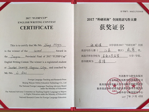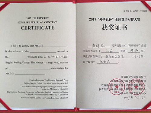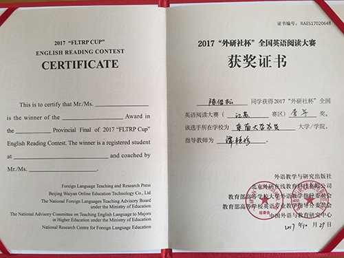 2017年 “外研社杯”全国大学生英语挑战赛江苏赛区比赛于11月4日在常州大学圆满落下帷幕。该挑战赛分为英语写作大赛、英语阅读大赛和英语演讲大赛三部分。开云2014级建筑工程2班陈俊松(指导老师:谭艳珍)在英语阅读大赛中获一等奖,这是目前开云在省级英语阅读比赛中获得的最好成绩。此外,2017级工商管理类2班张明琪(指导老师:李倩)获江苏赛区英语写作大赛二等奖;2017级工商管理类5班龚洁茹(指导老师:朱宇博)、2015级电子商务2班桑明珠(指导老师:燕如萍)获江苏赛区英语写作大赛三等奖。