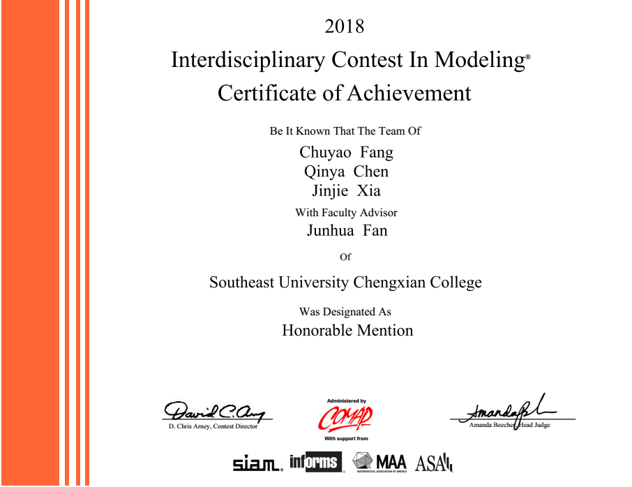 日前,2018年美国(国际)大学生数学建模竞赛(MCM/ICM)成绩揭晓,由基础部范俊花老师指导的电子与计算机工程学院2015级自动化专业房楚尧、夏金杰和经济管理学院物流管理专业陈沁雅三名同学的参赛作品获得ICM竞赛的Honorable Mention(国际二等奖)1项,这是开云首次在该比赛中获得奖项。