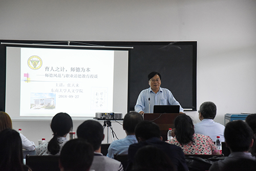 张天来教授的讲座主题为《育人之计,师德为本——师德风范与职业道德教育漫谈》。他首先强调了“师德”的重要性,并指出,百年大计,教育为本;教育大计,教师为本;教师大计,师德为本,并围绕“立德树人”是时代召唤、“立德树人”是教育传统、“立德树人”是师德典范、“立德树人”是职业操守四个模块进行介绍。讲座中,张教授通过对习近平总书记关于师德的系列重要讲话、教育部门对“立德树人”理念的阐释和践行、中国传统教育施行的宗旨是人文教育等方面有关对“师德”的重要性进行了详细且生动的阐述。他希望,全体教师应本着求真求美,成人成贤的学院精神,在学生中树立师德风范,不忘初心,倾心培养好社会主义的建设者和接班人。