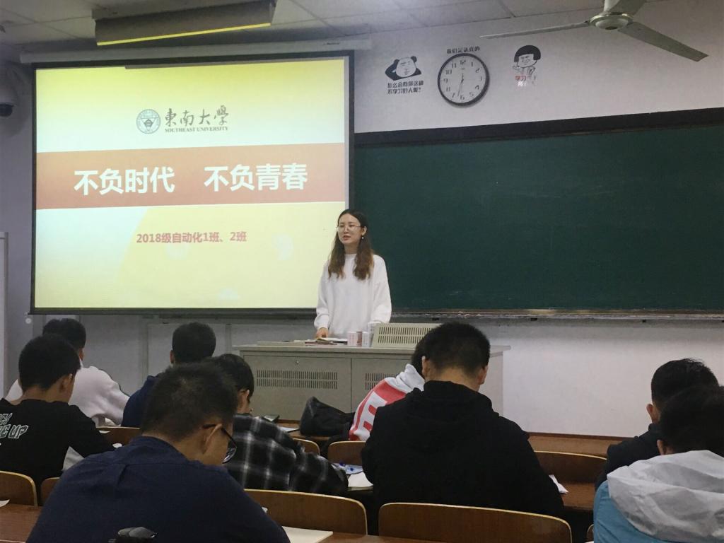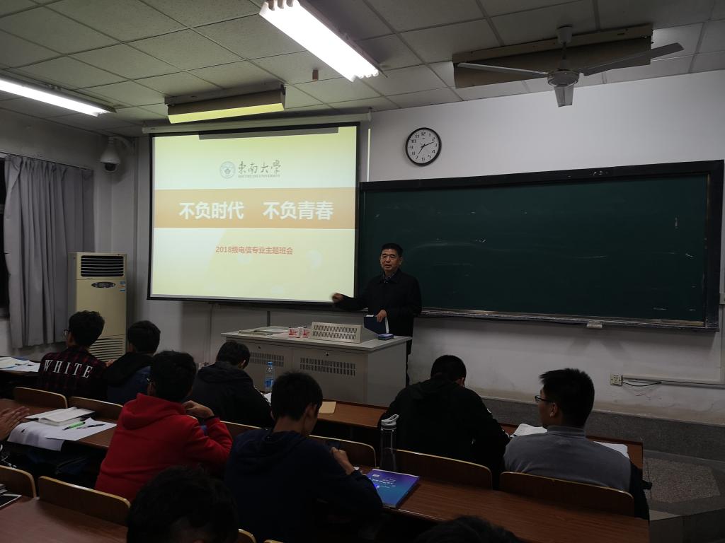 徐悦书记作为班主任作的主题发言,从形势政策教育入手,引导学生树立正确的世界观,认清时代潮流、努力学习、树德成才、不负青春、不辱使命、报效国家。从时代赋予使命、青春在于奋斗和细节决定成败三个层面展开。他说,改革开放四十年来,中国取得举世瞩目的成就。这一切成绩的取得,说明了坚持中国共产党的领导,走中国特色社会主义道路,是人民的选择,时代的选择;青年学生要顺应时代潮流,为中华民族的振兴而学习,不负这个伟大的时代,在大学期间努力学好专业知识,不负青春年华,成为国家和民族的脊梁;在奋斗的过程中,细节往往决定成败。“失之毫厘,谬以千里”,无论做人、做事,都要注重细节,从小事做起。“不积跬步无以至千里,不积小流无以成江海”,同学们要成就一番事业,要有所作为,要获得成功,就要从细处着眼,从身边的小事做起,把一个个小的成果聚集起来,才能获得更大的胜利果实。最后,对同学们提出两点建议:一要“做对的事”,认真学习,勤于思考,用马列主义来武装自己,形成正确的世界观,去认识问题、分析问题和解决问题。二要“把对的事做好”,要学会科学的学习方法,养成良好的学习生活习惯,在思想和学业上不断进步,成长成才,不负青春,成为人生赢家。