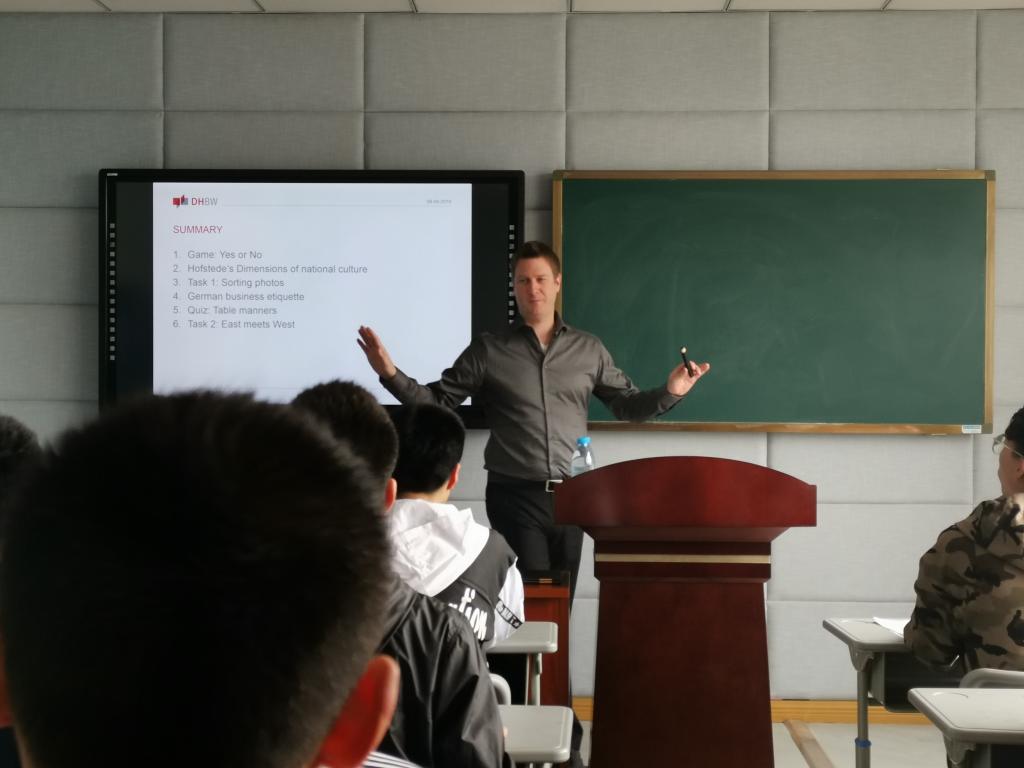 “德国文化与交际能力”研讨课在华罗庚馆303教室进行,费希尔先生上课前做了充分的教学准备和精心的课程设计,他通过简单的互动小游戏“YES/NO”抛砖引玉,活跃了课堂氛围,激发了在座学生的兴趣和好奇心。费希尔先生发放资料卡片,利用精彩的PPT画面及丰富的肢体语言引发学生思考,让大家身临其境地领悟和感受德国文化的魅力。研讨课上采用小组讨论互动的教学模式,让学生们进一步地了解中德文化的差异性。