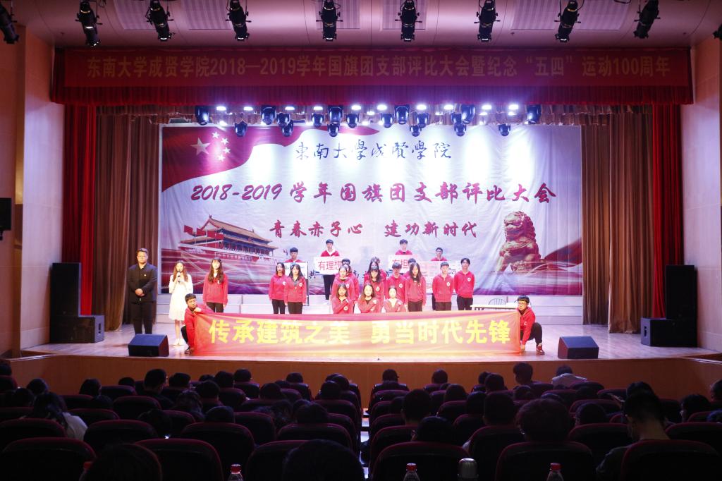 大会以慷慨激昂的《光荣啊,中国共青团》团歌拉开帷幕,紧接着,通过短视频回顾了上一年优秀特级团支部的风采。随后,入选的9个团支部根据抽签顺序展示了各支部在基层团支部建设、班风学风建设、思想教育建设上取得的进展与成绩,评委根据各支部递交的材料及现场的展示、答辩各方面情况进行综合打分。经过激烈角逐,2017级建筑学1团支部获新年度“国旗团支部”“活力团支部”荣誉称号;2017级交通运输1团支部、2017级药事管理2团支部获“活力团支部”荣誉称号。