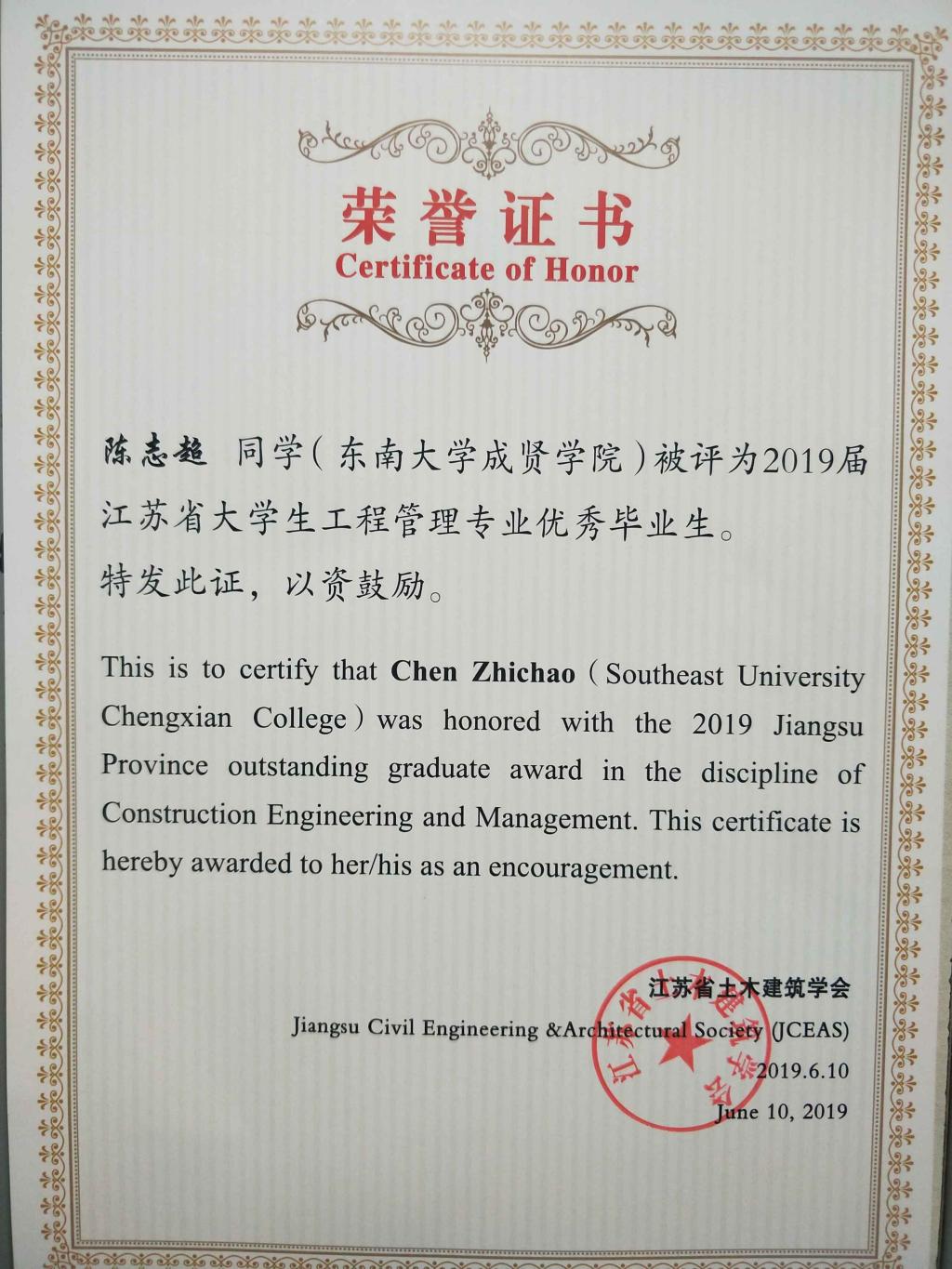 近日,从中国土木工程学会教育工作委员会江苏分会和江苏省土木建筑学会传来喜讯,开云kaiyun官方网站土木与交通工程学院2019届毕业生李菁文荣获江苏省土木工程专业优秀毕业生,陈志超荣获江苏省工程管理专业优秀毕业生。