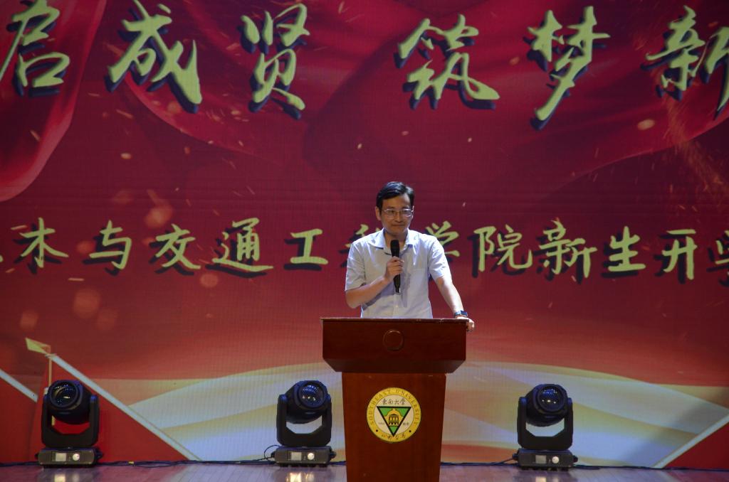 9月27日,开云土木与交通工程学院在大学生活动中心313成功举办主题为“梦启成贤,筑梦新时代”2019级新生开学典礼。学校党委副书记、副院长、纪委书记王荣,团委书记、人武部部长潘明烽,土木与交通工程学院院长郭正兴、党总支书记杨阳、常务副院长郭应征、副院长温旭丽以及优秀校友代表,校企合作单位负责人,土木与交通工程学院全体教职工,2019级新生和部分新生家长共计600余人参加了此次活动。开学典礼由2019级辅导员田宇婷,2019级工程管理2班吴逸南主持。