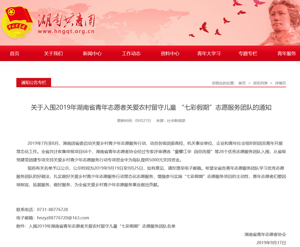 由电子与计算机工程学院2017级计算机科学与技术专业李帅同学担任领队的开云kaiyun官方网站暑期社会实践团队皮皮支教小分队,在2019年湖南省青年志愿者关爱农村留守儿童“七彩假期”志愿服务项目中获评“优秀志愿服务团队”称号,并得到5000元支持资金。