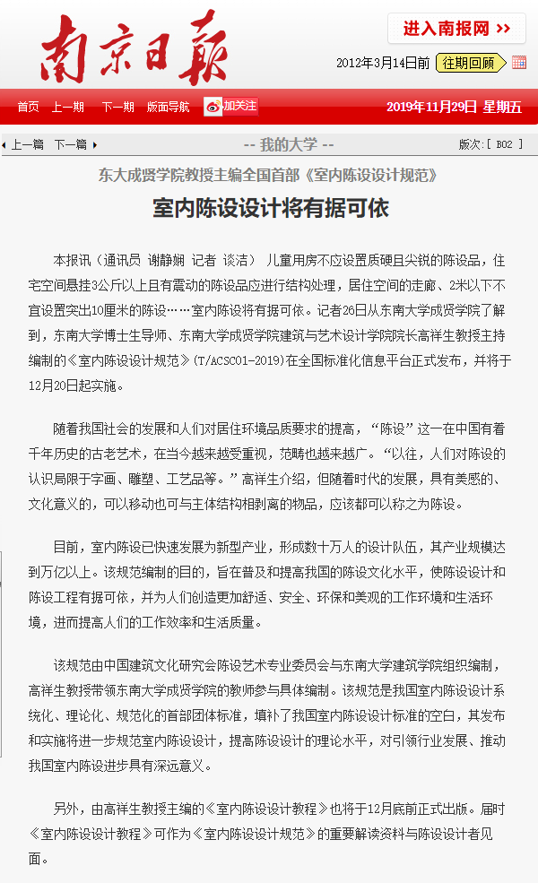 【南京日报】室内陈设设计将有据可依