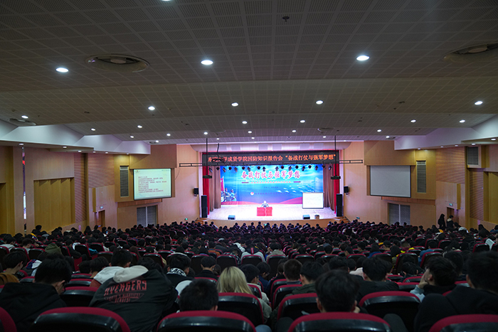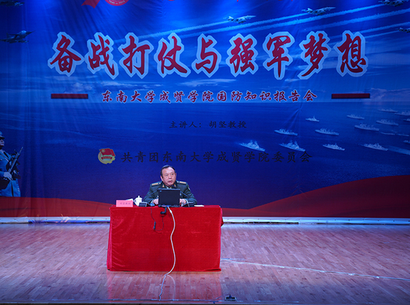 会上,胡教授以军人的壮志豪情、教师的生动语言、专家的渊博学识征服了广大师生。他从备战之路、挑战之忧、胜战之问三个方面,为成贤师生上了一堂非常精彩的国防教育课和别开生面的思想政治课,赢得了现场观众一次又一次热烈的掌声。胡教授强调,强国梦和强军梦是一体的,军人要有随时上阵、能打胜仗的充分准备和闻战则喜、永不言败的意志品质;作为新时代大学生,要自觉锤炼毅力,树立随时应对考试、迎接困难挑战的各项准备,要特别重视平时的刻苦攻读和总结积累,坚决不打没把握的仗;鼓励学生们一定要珍惜和平安宁的美好时光,努力学习,将来为祖国的国防事业作出积极贡献。最后,校团委书记、人武部部长潘明烽代表学校衷心感谢胡教授来校宣讲,希望学生们牢记胡教授的教诲,做有理想、有担当、有血性的时代青年,在国家富强、民族振兴、人民幸福的时代潮流中筑牢忧患意识、积累知识本领,为伟大中国梦、强军梦刻苦攻读、报效国家。