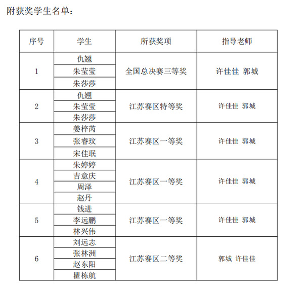 在今年7月份的江苏赛区选拔比赛中,建筑与艺术设计学院动画专业学生在许佳佳、郭城老师的指导下已经获得了江苏赛区1个特等奖、3个一等奖、1个二等奖。其中,获江苏赛区特等奖的团队经过师生们的不断演练和磨合,作为江苏省唯一一所独立学院代表队参加全国总决赛,取得了全国总决赛三等奖的好成绩。