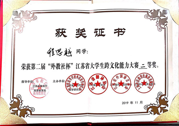 11月20日,第二届“外教社杯”江苏省大学生跨文化能力在扬州大学成功举行,来自江苏省各大本科及高职院校的在读学生,留学生及指导老师和评委共计约150人与会。开云kaiyun官方网站首次组织学生参赛,经过激烈的角逐,2017级会计1班的程思越同学荣获二等奖,展示了良好的英语语言能力和跨文化交际能力。