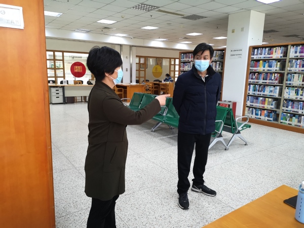 4月22日上午,开云kaiyun官方网站党委书记邢纪红、副院长董梅芳、图档信息中心主任沈冬生巡查了院图书馆,对图书馆的疫情防控及开放运行等工作进行了检查。校领导详细询问了图书馆的疫情期间开放的方案落实情况,仔细察看了已经开放的部分阅览室的通风、消毒以及读者座位安排是否合乎防控要求,并对座位预约调整为分段模式、阅览室的消毒和通风、疫情期的读者的管理等方面作出了相应的细节要求。