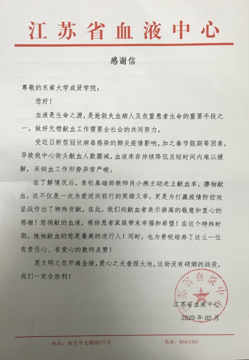 受疫情影响,医疗临床用血非常紧张。得知情况后,基础部肖小燕老师、建筑与艺术设计学院胡查剑同学毫不犹豫地走上献血车,撸起袖子献血。肖小燕老师表示,在全国抗击疫情的非常时期,尽管无法像“逆行者们”一样奋战在抗疫一线,但也希望能做一些力所能及的事情,用热血守护生命,尽绵薄心意。江苏省血液中心在来信中,对两位有责任心、有爱心的师生表示感谢。