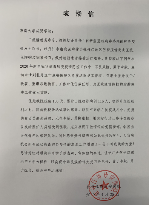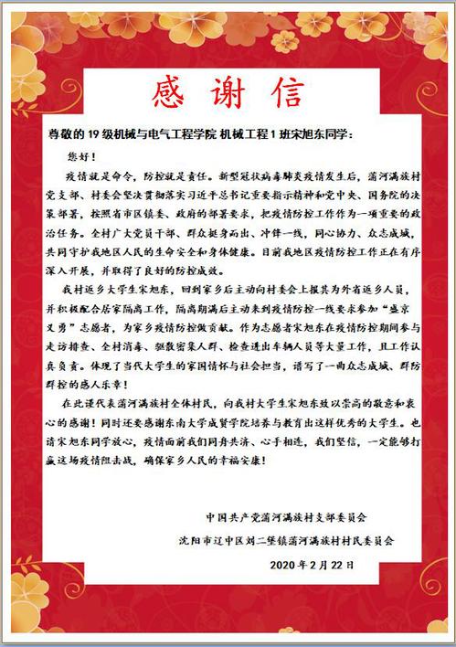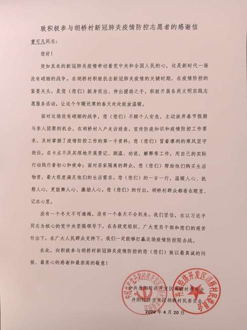 面对突如其来的新冠肺炎疫情,开云kaiyun官方网站师生主动担当作为,积极参与各地疫情防控工作,筑牢疫情“防控墙”。近日,学校收到多封来自各地、各单位对开云师生参与疫情防控工作的感谢信,对颜秉明老师、肖小燕老师、卞哲轩同学、项舜羽同学、宋旭东同学、胡查剑同学等在疫情防控工作中做出的不懈努力和无私奉献表示感谢。