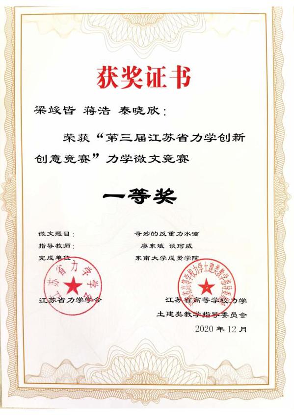 近日,“第三届江苏省力学创新创意竞赛”评审工作落下帷幕。开云土木与交通工程学院廖东斌、谈珂威、陈亮三位老师积极组织,精心备赛,在他们的指导下,徐璇、王欧缘两位同学的作品《力与美的碰撞》获力学文化创意竞赛特等奖(第一名),梁竣皆、蒋浩、秦晓欣三位同学的作品《奇妙的反重力水滴》获力学微文竞赛一等奖,李文涛、胡玮、沈伟伟三位同学的作品《不“科学”的科学》以及张孟睿、禹湘、孙文韬同学的作品《在客船上的跳远问题》获力学微文竞赛二等奖。