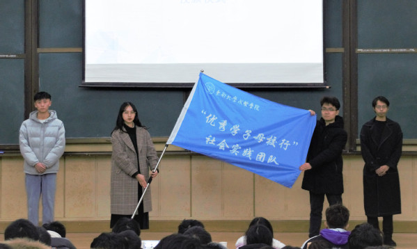 第三届“优秀学子母校行”活动获奖代表黄辰同学与志愿者们交流了活动经验与心得。随后,进行了优秀学子母校行社会实践队旗授予仪式。