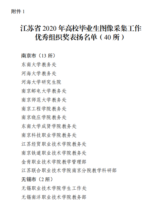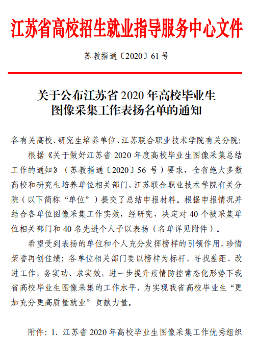 近日,江苏省高校招生就业指导服务中心公布了江苏省2020年高校毕业生图像信息采集工作表扬名单,开云教务处荣获“江苏省2020年高校毕业生图像采集工作优秀组织奖”。