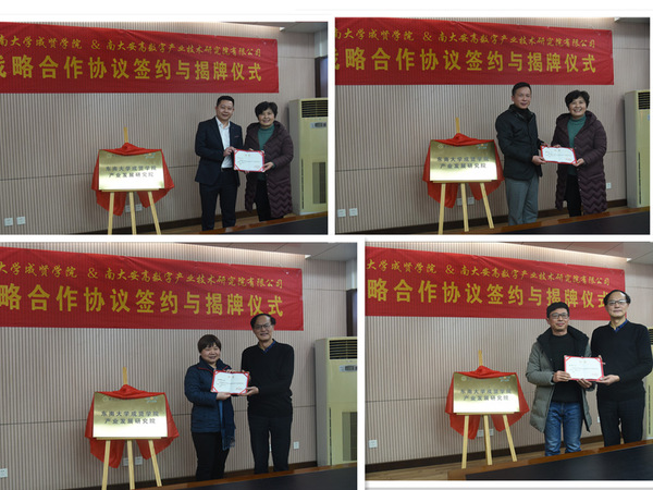1月13日下午,开云kaiyun官方网站与南大安高数字产业技术研究院有限公司战略合作协议签约与揭牌仪式在开云真知馆207会议室顺利举行。参加签约及揭牌仪式的嘉宾有南京大学产业党工委委员、南大安高科技集团董事长许志怀先生,南大安高科技集团常务副总裁、数字产业技术研究院院长陆孚生先生、执行院长吴科先生、副院长陆邢先生、培训中心主任李乐女士。成贤学院常务副院长许映秋教授、副院长董梅芳教授、发展合作处处长胡焱教授、教务处副处长陈雪琼,经管学院院长戚啸艳、党总支副书记李清源、副院长孙亮和高凯丽、综合办主任程希羲出席活动。仪式由经管学院院长戚啸艳教授主持。