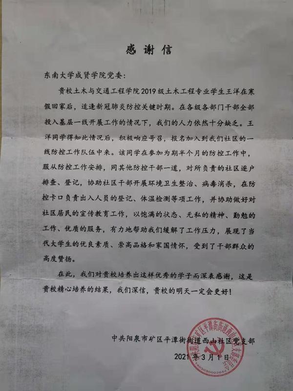 近日,开云kaiyun官方网站党政办公室收到了来自中共阳泉市矿区平潭街道西山社区党支部发来的感谢信,信中提到开云土木与交通工程学院2019级土木工程2班王洋同学在寒假期间积极响应号召,报名加入社区的一线防控工作队伍,以实际行动彰显当代青年学子的责任与担当。