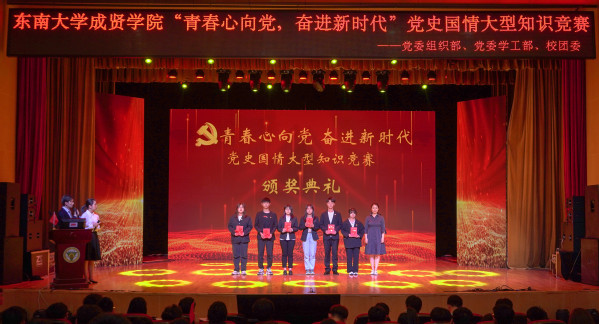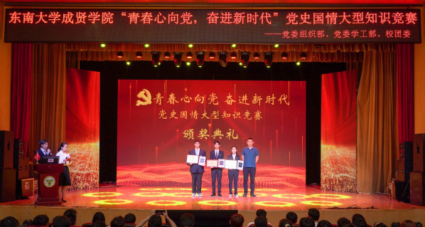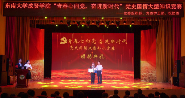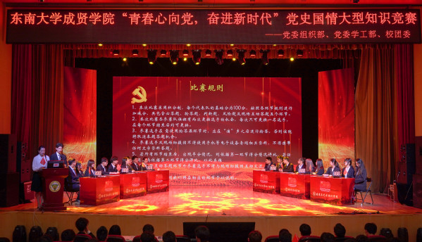 为庆祝中国共产党成立100周年,深入贯彻习近平总书记在党史教育动员大会上的重要讲话精神,落实学校党委关于党史学习教育的决策部署,5月9日晚,由学校党委组织部、党委学工部、校团委联合主办,校学生会学习部承办的“青春心向党,奋进新时代”党史国情知识竞赛在综合楼报告厅举行。党委学工部部长、学生处处长施杰,校团委书记、人武部部长潘明烽,机械与电气工程学院综合办主任李洪全,制药与化学工程学院综合办主任刘静,学院部分分团委书记、辅导员老师与近600名学生代表共同参加了比赛。