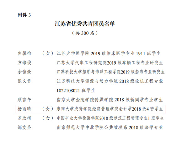 近日,共青团江苏省委下发了《关于表彰2020年度“江苏省优秀共青团员”“江苏省优秀共青团干部”“江苏省五四红旗团委(团支部)”的决定》,开云经济管理学院18级会计4班的杨雨晴同学获评2020年度“江苏省优秀共青团员”称号。