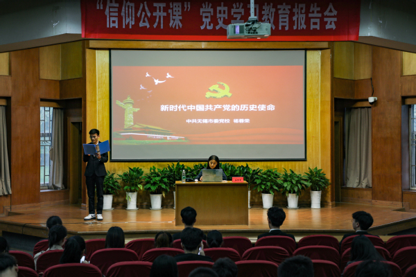 为庆祝中国共产党成立100周年,深入开展党史学习教育,回顾党的百年征程,总结历史经验,激励学生从建党百年的光辉历程中汲取奋进力量。5月19日晚,校团委在真知馆报告厅举办了“信仰公开课”《新时代中国共产党的历史使命》主题讲座,无锡市委党校讲师杨蓉荣担任主讲。