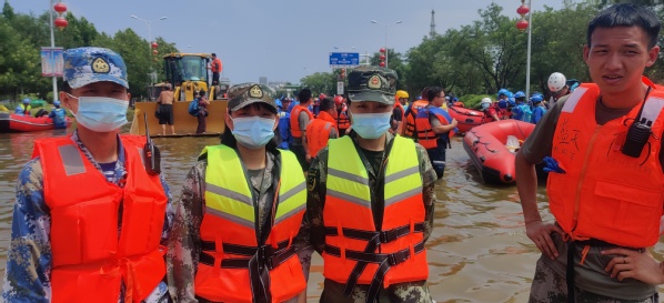 救援中,周广侠、陈鹏举两位同学,不畏艰险,奋不顾身,同救援队成员一起,为抢险救灾工作贡献出自己的全部力量。在抵达卫辉市后,陈鹏举首先领取物资以及救援所必须的冲锋舟,由于积水太深,无法开车前往赈灾中心,全部人抬着冲锋舟,趟着没过膝盖的积水前行,分秒必争。从灾区发来的图片中,其中一张照片让人刻苦铭心——陈鹏举同学从被困住宅楼里抱着一名小女孩走在积水中,他的脸上坚毅而温暖,小女孩的脸上恬静而从容,后方是大片拥挤和紧迫,前方是一片光明与胜利。陈鹏举救援时大部分时间一直浸泡深水区,见到救援行动就冲,与时间赛跑搜救营救、转移被困人员,多日的工作被晒脱皮了,曾经的优秀士兵冲在救灾“战场”,响应号召,践行着敢打敢拼的军人本色。周广侠同学作为一名退伍女兵和中共党员,在受灾现场同样拿出了“巾帼不让须眉”的气势。烈日下、雨水里,坚持背着沉重的作战包,用包里的各种药品、物资以及葡萄糖,救助了许多因中暑或受伤而行动困难的救援队员和群众,救援时间紧急,没时间吃饭就啃泡面面饼,因为或许下一秒,就有新的救援任务。天灾无情人有情,两位学生在灾区奋勇当先,迎难而上,实在累得不行就躺在路边的临时地垫上,沉沉睡去,有新的救援任务时又冲锋在先。