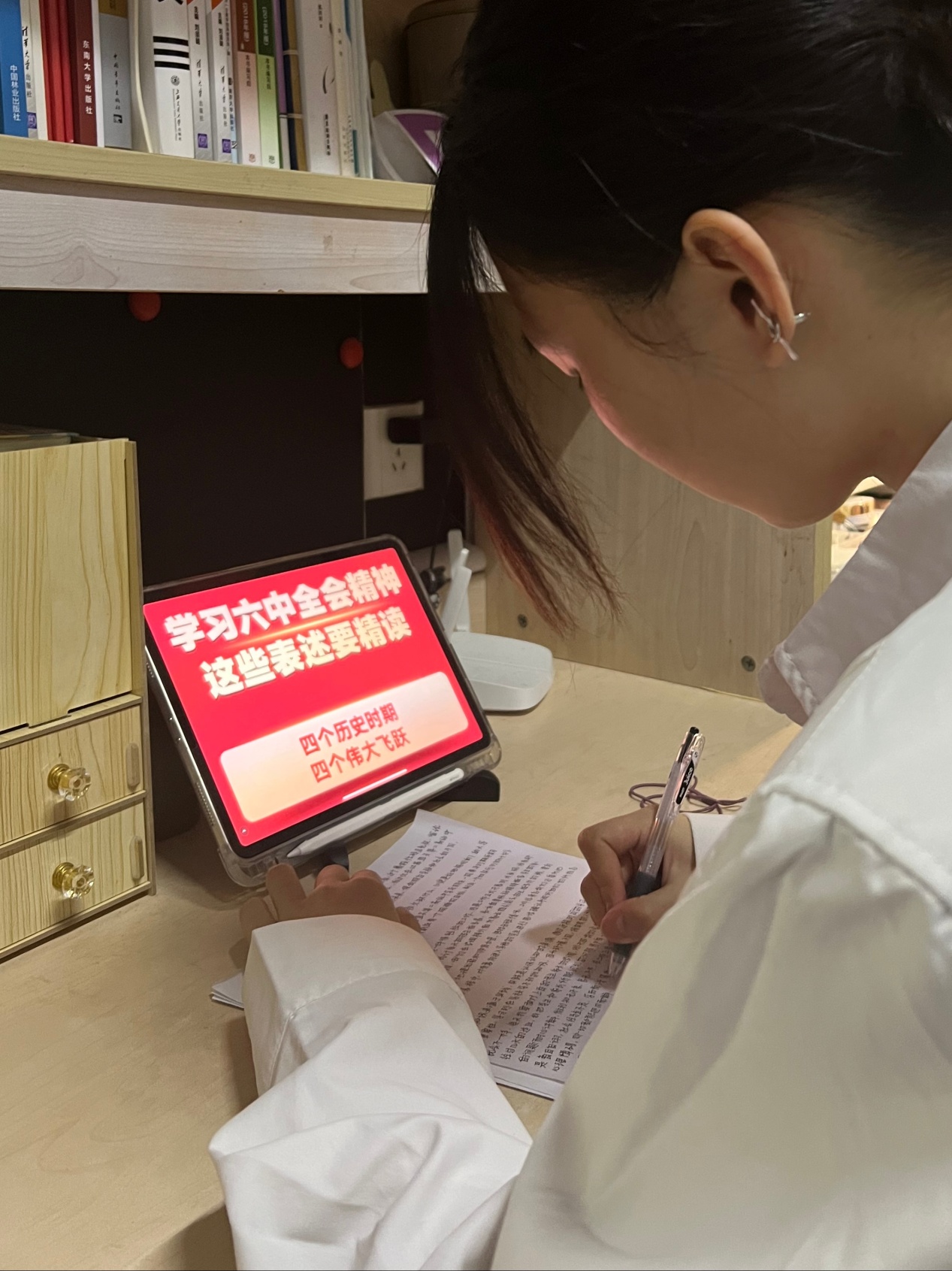 党的十九届六中全会提出了中国共产党百年奋斗的历史意义和宝贵经验,对实现中华民族伟大复兴起到至关重要的作用。作为青年大学生的我们,在这个紧要关头,为国家出一分力发一分光是我们肩上应该扛起的责任,我们应当紧紧跟随中国共产党的步伐,以昂扬向上的精气神,奋进新时代,在党的带领下走好我们的第二个一百年征程。