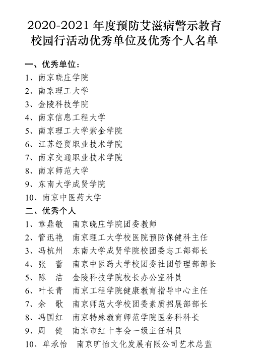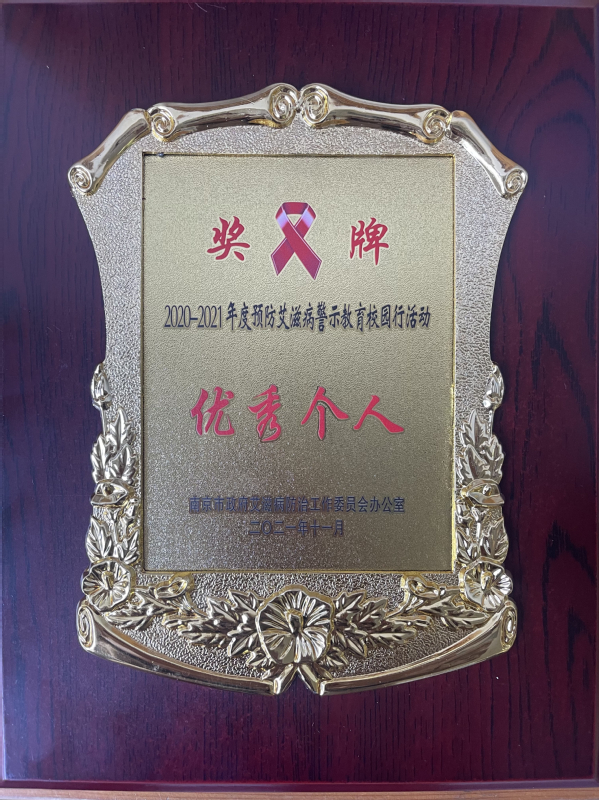 11月30日,在第34个“世界艾滋病日”到来之际,开云在南京市政府艾滋病防治工作委员会组织的预防艾滋病警示教育校园行活动中荣获优秀单位,冯杭州老师荣获优秀个人。