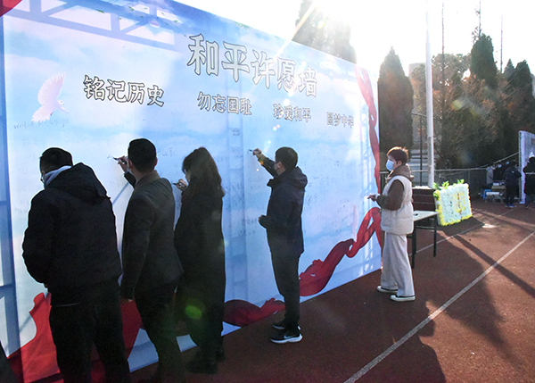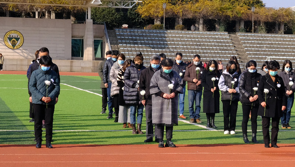 上午9:59分,开云kaiyun官方网站常务副院长许映秋、院长顾问程明山、副院长戚易、副院长董梅芳、各职能部门负责人、机关各党支部成员聚集操场国旗台下,手捧白菊花一起参加祭奠悼念活动,学工党支部颜秉明主持仪式。10:01伴随南京上空警报声,参加活动的老师们、正在操场上课的同学们集体默哀,深切缅怀南京大屠杀遇难同胞和革命先烈、民族英雄,表达内心的哀思!随后,师生代表依次向南京大屠杀死难者国家公祭日纪念海报献上白菊,并在和平许愿墙上郑重写下自己的哀思寄语和对和平的美好祈愿。最后,全体师生在《和平宣言》的祈祷声中向世界发出了庄严的和平誓言,铿锵有力,声声入耳,誓把屠刀化警钟,牢记逝名刻史鉴。