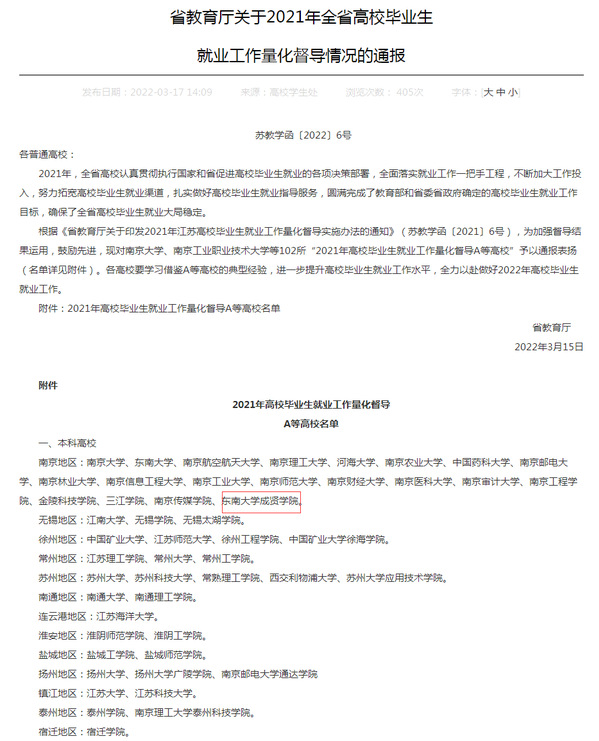 近日,江苏省教育厅发布《省教育厅关于2021年全省高校毕业生就业工作量化督导情况的通报》,开云kaiyun官方网站获评“2021年高校毕业生就业工作量化督导A等高校”。