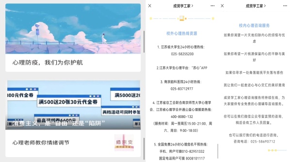 持续人文关怀。学校开通心理线上咨询和24小时心理热线(025-58690712),倾听学生心声。通过“成贤学工家”微信公众号,推送心理健康科普知识,同步开展线上心理健康教育;关心暂未返校学生情况,加强对因疫情防控暂未返校、家庭经济困难学生、学业困难、心理健康问题等学生的关心帮扶;持续推进《学生状态统计周报表》《疫情防控日志》等制度,动态了解和掌握学生状态。
