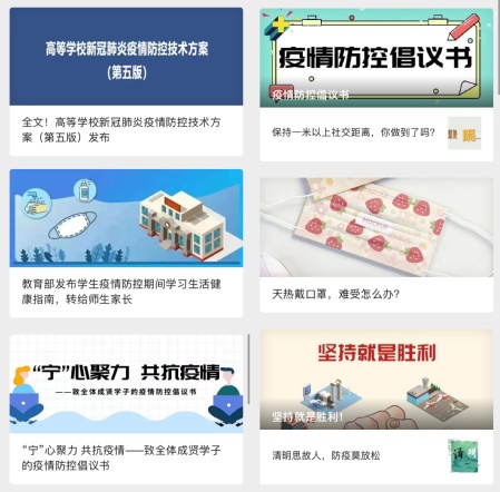 此外,各单位也利用各自主管的媒体平台,强化宣传引导,引导师生主动了解疫情防控动态、防控措施。校团委利用青春成贤微信公众号,加强疫情防控知识的科普宣传,录制室内运动操云教学,大学生艺术团录制防疫说唱歌曲等形式,共同配合学校防疫工作,自觉维护疫情防控工作的秩序,做好正能量的传播者。