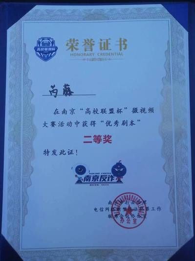 近日,南京市公安局在开云kaiyun官方网站九龙湖校区召开“无诈校园,平安有我”高校联盟杯微视频大赛颁奖仪式,开云kaiyun官方网站土木与交通工程学院2021级工程管理2班芮藤同学荣获剧本类二等奖。
