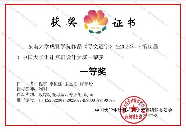 近日,2022年(第15届)中国大学生计算机设计大赛落下帷幕。由建筑与艺术设计学院动画专业刘刚老师指导的程宇、李恒建、张昱雯、许字玢等学生团队作品《寻文逐字》继获得江苏省“特等奖”后,荣获国赛“一等奖”。