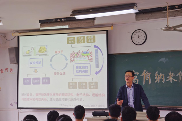 讲座中,张一卫教授同学们详细介绍了在纳米贵金属催化领域如何通过多种途径提高纳米金属颗粒的热稳定性,同时,他还启发大家在能源催化领域要从生活和自然中发掘灵感,设计具有特定结构、特殊功能的催化剂和具有特殊孔道分布的载体。最后,张教授提出“兴趣是最好的老师”,希望同学们在平时的专业学习中,认真梳理课程知识体系,多总结错题,并尽早合理规划人生,在考研备战过程中,奋发进取,砥砺前行。