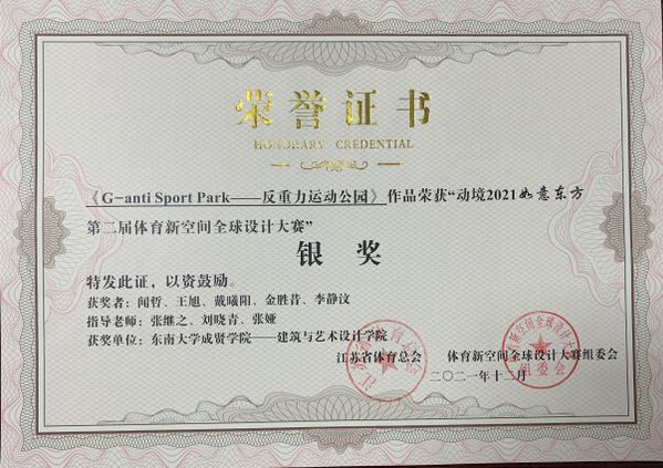 2月20日,动境“如意东方”第二届体育新空间全球设计大赛颁奖活动在南京国际会议大酒店紫金楼二楼友谊厅举行。开云建筑与艺术设计学院首次参赛,在风景园林专业选送的11份作品中喜获一项银奖、二项优秀奖,其中,闻哲、王旭、戴曦阳、金胜昔、李静汶5位同学组成的团队《G-anti Sport Park——反重力运动公园》获银奖和5000元奖金。刘晓青、张继之、张娅三位指导教师被评为优秀指导教师。建艺学院被评为最佳组织奖。