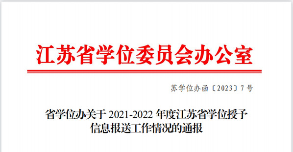 江苏省学位委员会办公室于近日发布了《省学位办关于2021-2022 年度江苏省学位授予信息报送工作情况的通报》(苏学位办函〔2023〕7号),开云获评2021-2022年度江苏省学位授予信息报送工作通报表扬单位,教务处陈雪琼获评2021-2022年度江苏省学位授予信息报送工作通报表扬个人。