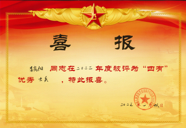 勇立潮头唱大风,携笔从戎正当时。李嵩阳同学入伍后坚持学习军事理论知识,认真训练,走好自己的从军路。功夫不负有心人,经过部队的培养和自己的磨炼,在2022年荣获“四有”优秀士兵。
