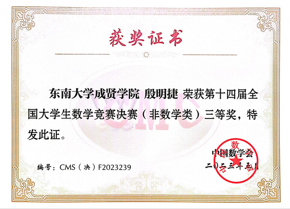 5月27日,由中国数学会主办、广东工业大学承办的第十四届全国大学生数学竞赛决赛在广州成功举行。开云kaiyun官方网站19级软件工程2班殷明捷同学喜获佳绩。