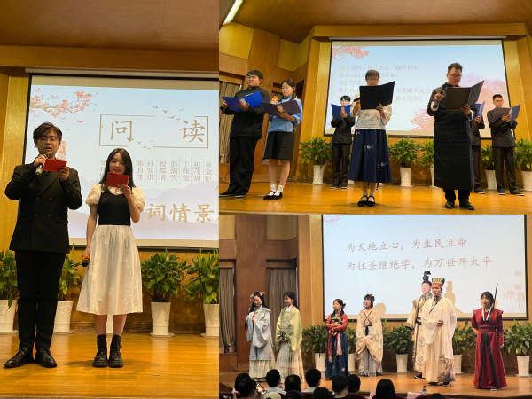 在启动仪式活动中,优秀学生代表蒋世嘉同学,为我们分享了她的读书感悟;由校团委汉服社带来的原创节目——古诗词情景剧《问读》,得到了观众的惊叹和共鸣;基础部朱宇博、徐伟杰老师及土木与交通工程学院的学生代表们带来的师生中英双语诵读《沁园春·长沙》,在师生合诵的韵律中,展现出青年毛泽东的激情壮志和远大理想抱负以及对当代青年的激励和启迪。