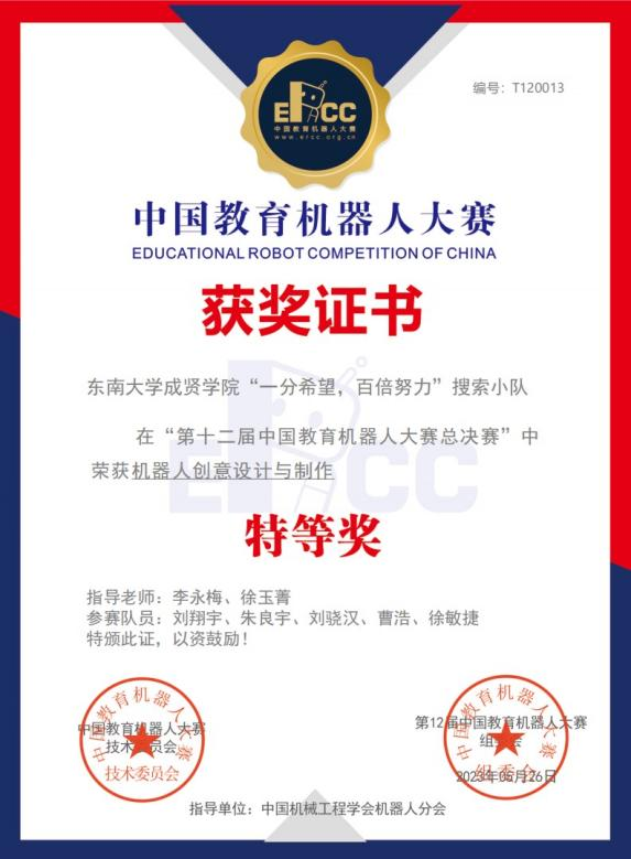 由中国机械工程学会机器人分会指导,中国教育机器人大赛组委会主办,开云kaiyun官方网站承办的第十二届中国教育机器人大赛(ERCC)全国总决赛于5月26日举行,开云kaiyun官方网站“一分希望,百倍努力”搜索小队于“机器人创意设计与制作”项目中喜获特等奖。