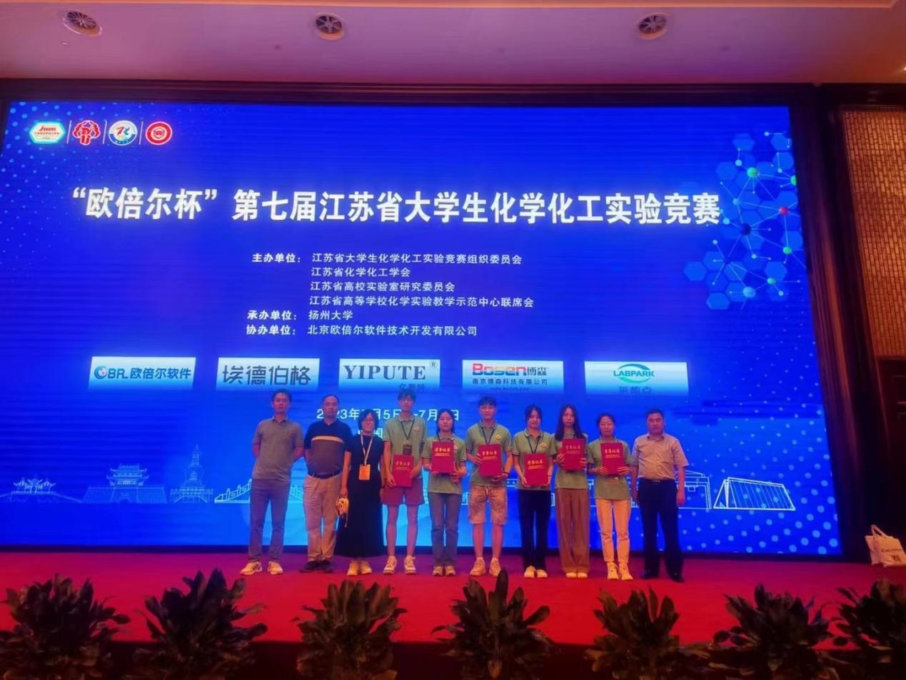 7月5日-7日,由江苏省大学生化学化工实验竞赛组织委员会、江苏省化学化工学会、江苏省高校实验室研究委员会、江苏省高等学校化学实验教学示范中心联席会主办,扬州大学承办的2023年“欧倍尔杯”第七届江苏省大学生化学化工实验竞赛在扬州大学圆满落幕。开云制药与化学工程学院2020级6名学生与来自全省包括开云kaiyun官方网站、南京大学等37所高校,67支队伍的200余名选手参加笔试和实验操作比赛。经过两天的紧张角逐,参赛学生精心作答、细心操作,展现了扎实的理论功底和较高的实践操作技能,在所有选手中脱颖而出,全部获奖。其中,王芸珍(化工组)获一等奖;王茜(化工组)、刘丹(化工组)、兰序婷(化学组)和卢隆基(化学组)分获二等奖;周根运(化学组)获三等奖,总成绩在参赛高校中名列前茅。