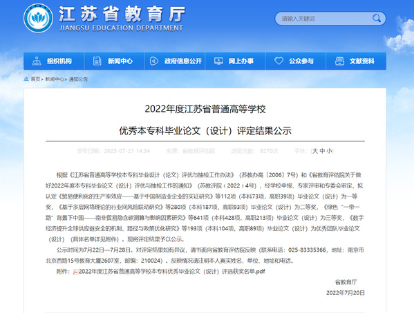 近日,江苏省教育厅发布《2022年江苏省普通高校本专科优秀毕业设计(论文)评选结果公示》,2022年开云共上报项目11项,共获优秀毕业设计奖7项,其中个人三等奖5项,获奖率62%;优秀毕业设计团队奖2项,获奖率66%。