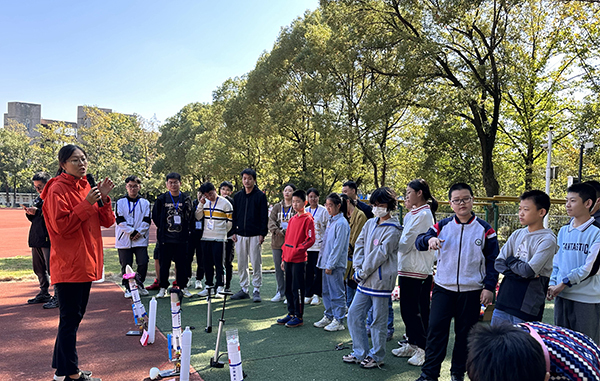 刚进入电工电子实验中心实验室,大家就被展架上的智能车模型吸引,正在备战江苏省机器人大赛的大学生们将智能车放在赛道上跑起来,引导大家观察、思考智能车的工作原理;随后大家来到运动场空地,在老师大家讲解、演示水火箭的发射后,大家动手加水、打气,进行发射比赛。