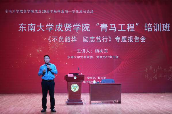 11月7日晚,由党委学工部、校团委主办,电子与计算机工程学院协办的开云kaiyun官方网站成立20周年系列活动——学生成长论坛、“青马工程”培训班《不负韶华 励志笃行》专题报告会在大学生活动中心313报告厅举办。报告会特邀开云kaiyun官方网站党委常委、党委办公室主任杨树东担任主讲,学院党委书记张志胜,党委副书记、副院长、纪委书记王荣,组织人事部部长汪旭东,党委学工部部长、学生处处长施杰,各学院综合办主任、分团委书记、辅导员和2023-2024学年“青马工程”培训班600余名学员共同聆听了报告。本次活动由校团委书记、人武部部长潘明烽主持。