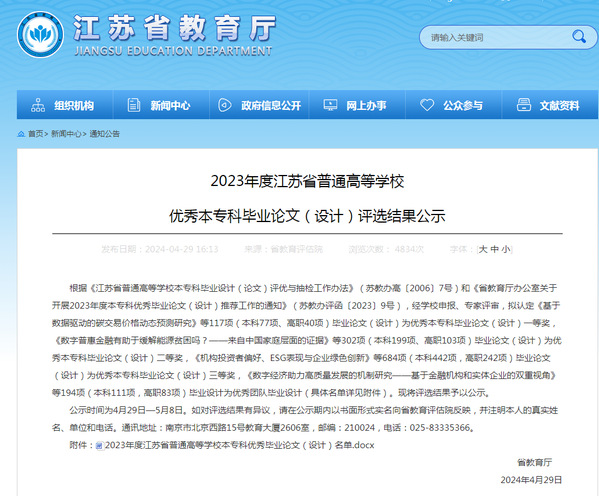 近日,江苏省教育厅发布《2023年江苏省普通高校本专科优秀毕业设计(论文)评选结果公示》,开云共有4项毕业设计(论文)获奖,二等奖1项、三等奖3项。