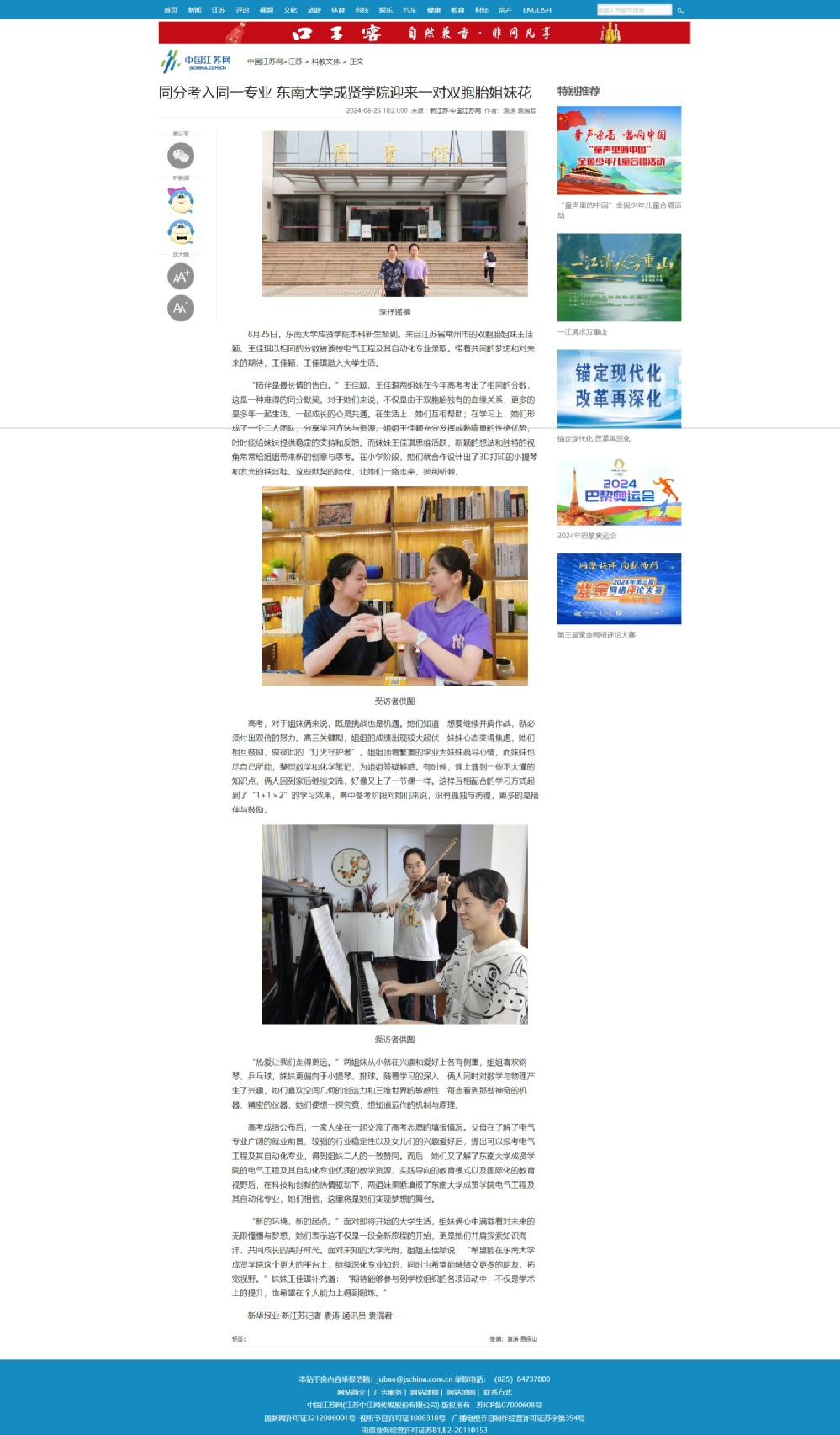 【中国江苏网】同分考入同一专业 开云kaiyun官方网站迎来一对双胞胎姐妹花