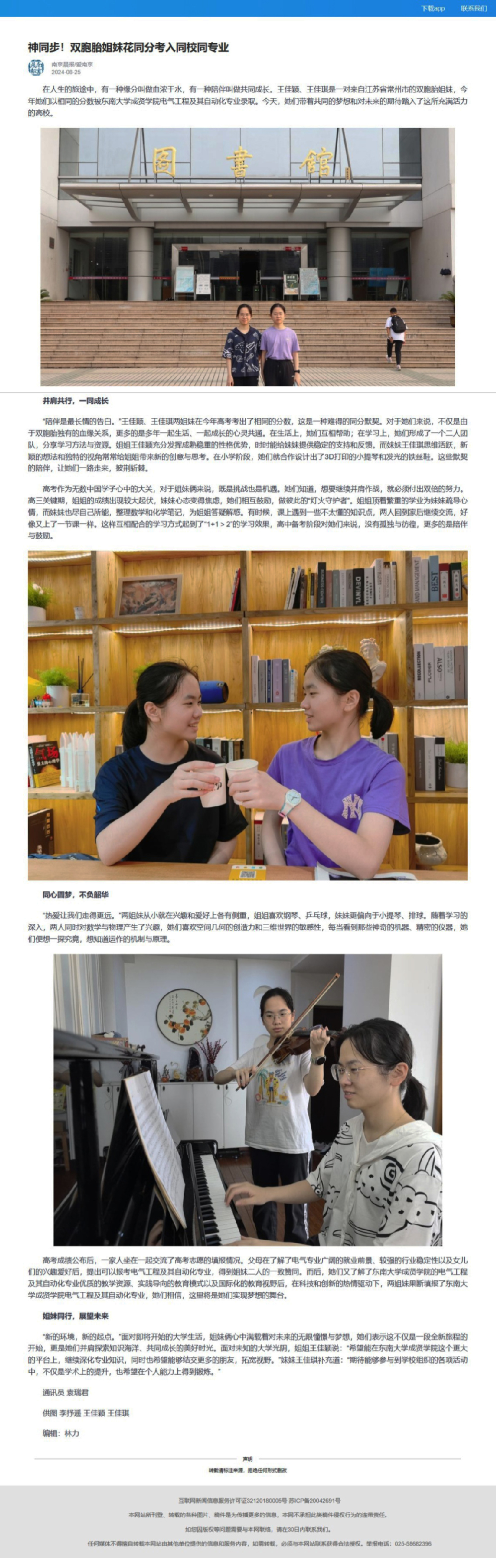 【南京晨报/爱南京】神同步!双胞胎姐妹花同分考入同校同专业